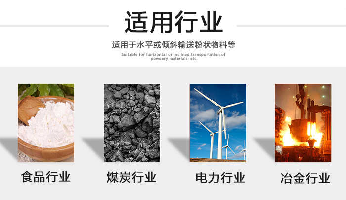 該設備廣泛適用于:煤炭,食品,冶金,化工,電力糧食等行業。適用于水平或傾斜輸送粉狀物料如:灰,渣,糧食,水泥,等物料溫度小于200℃。