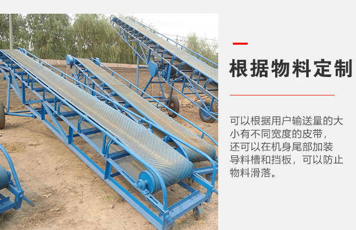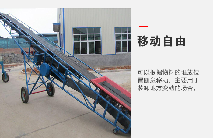 移動式皮帶輸送機可以根據用戶輸送量的大小有不同寬度的皮帶,還可以在機身尾部加裝導料槽和擋板,可以防止物料滑落。
