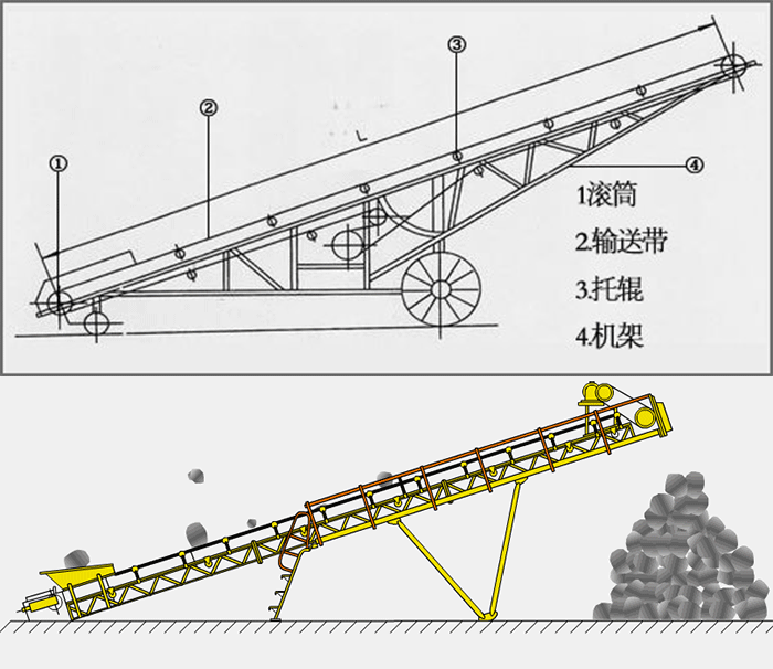 基本的皮帶輸送線由以下部分組成,各部分的作用分別為:輸送皮帶;從動輪;托板或托輥;主動輪