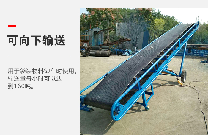 移動式皮帶輸送機可根據用戶輸送方向設計為向下輸送,一般用于袋裝物料卸車時使用,輸送量每小時可以達到160噸。