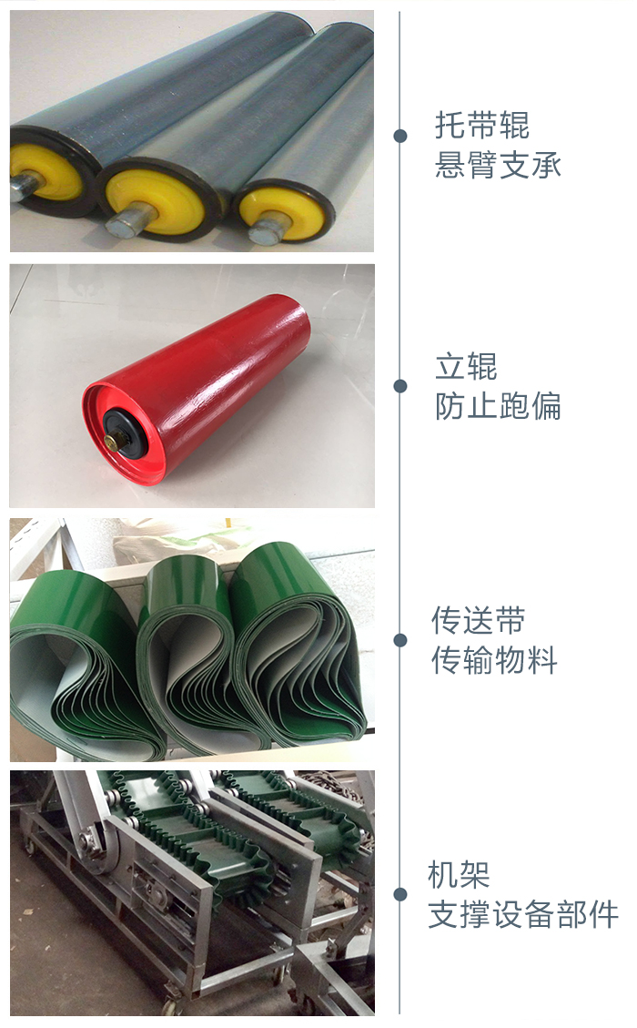機(jī)架、頭部漏斗、頭部護(hù)罩、導(dǎo)料槽、中間架、中間架支腿等:在輸送機(jī)中分別起支承、防塵和導(dǎo)料作用。