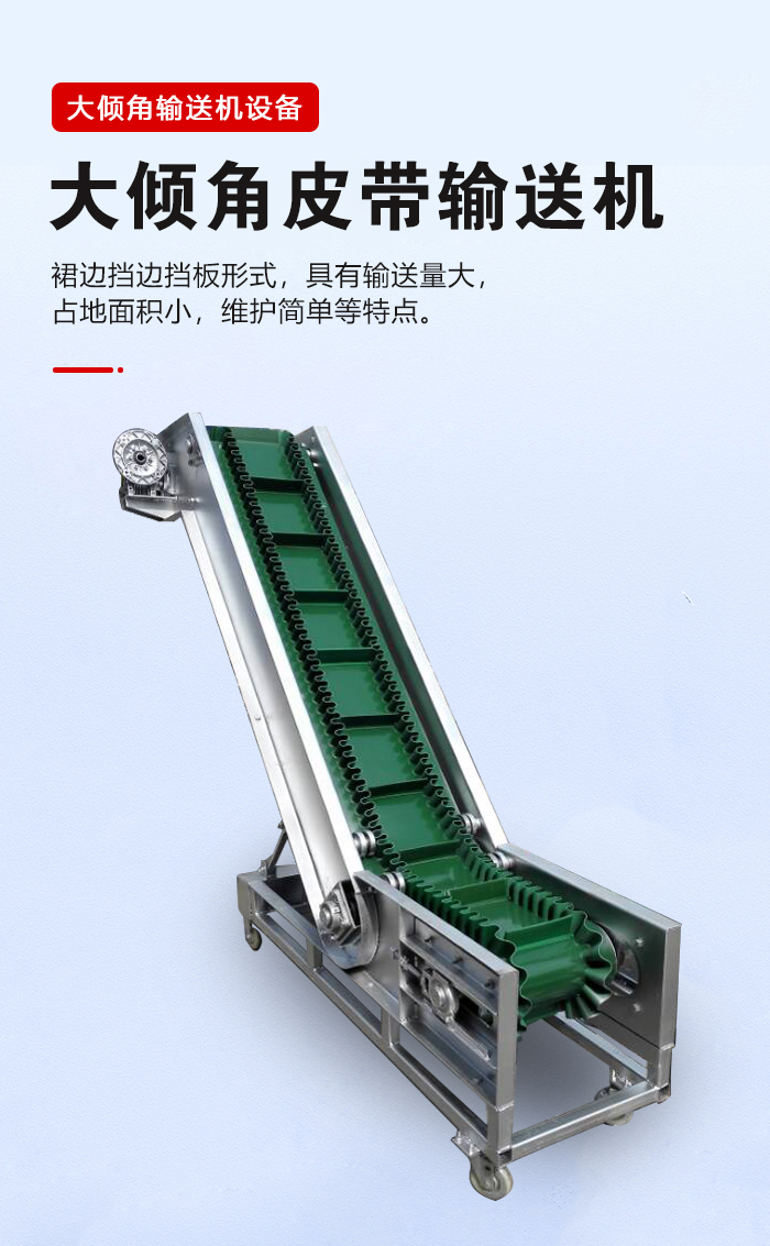 大傾角輸送機(jī)也叫大傾角皮帶輸送機(jī),是利用輸送帶上面的裙邊擋邊擋板形式,加上改向滾筒,可做成50-90度的角度。具有輸送量大,占地面積小,維護(hù)簡單等特點(diǎn),廣泛在。相比提升機(jī),具有。