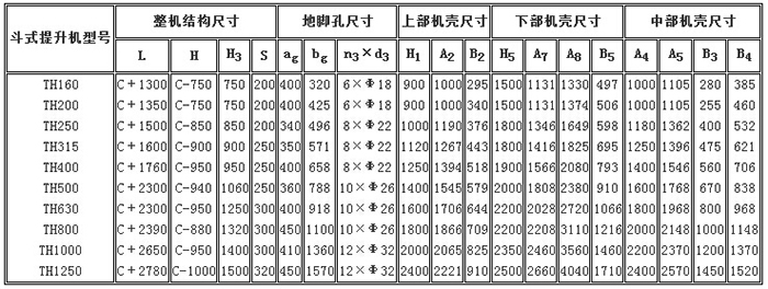本機(jī)共有: TH100、TH160、TH250、TH315、TH400、TH00、TH630等7種規(guī)格。本機(jī)的輸送能力為4-238m3/h,高度約在4-40m范圍內(nèi)。為滿足各種不同的使用要求,本機(jī)備有四種料斗制法: Q型(淺斗) 、H型(弧底斗) 、Zd型(中深斗)Sd型(深斗);傳動裝置法有左裝和右裝。