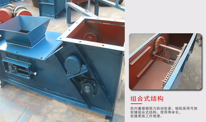 4,下部采用重力自動張緊裝置,能保持恒定的張緊力,避免打滑或脫鏈,同時料斗遇到偶然因素引起的卡殼現(xiàn)象時有一定的榮讓性,能夠有效地保護(hù)下部軸等部件。