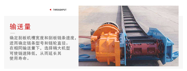 刮板輸送機輸送量可以確定刮板機槽寬度和刮板鏈條速度,進而確定鏈條型號和鏈輪直徑,根據鏈速和鏈輪直徑可以計算出刮板頭輪的轉速,在相同輸送量下,選擇稍大機型可使鏈速降低,從而延長其使用壽命。