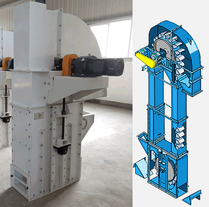 皮帶斗式提升機是常見的一種垂直輸送設備,是顆粒料與粉狀料有效的提升方式。由提升機上、下鏈輪,皮帶,挖斗,絲桿,進出料口,箱體,電機減速機等組成,具有輸送量大,提升高度高,運行平穩可靠,壽命長顯著優點